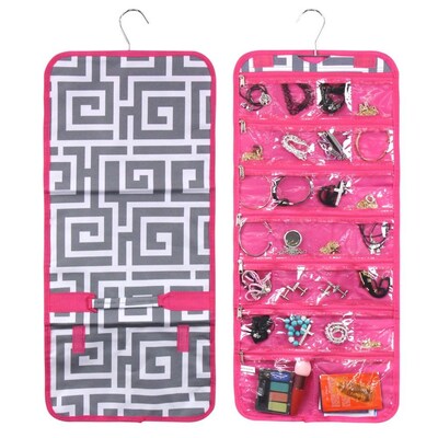 Zodaca Jewelry Hanging Travel Organizer Roll Bag Necklace Storage Holder Gray Greek Key Pink Trim