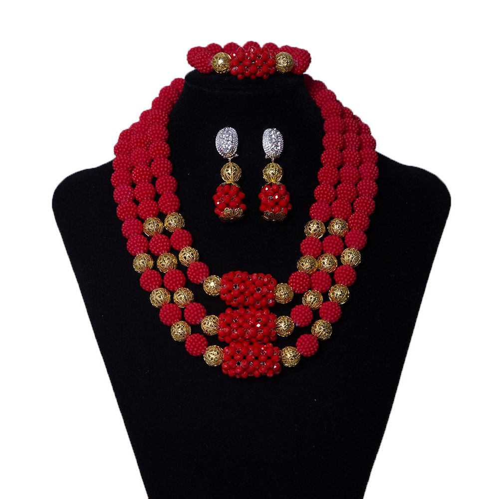 3 Rows Red And Gold Wedding Bridesmaid Crystal African Beads Jewelry Set Women Bridal Clothing Necklace Nigerian Wedding Beads